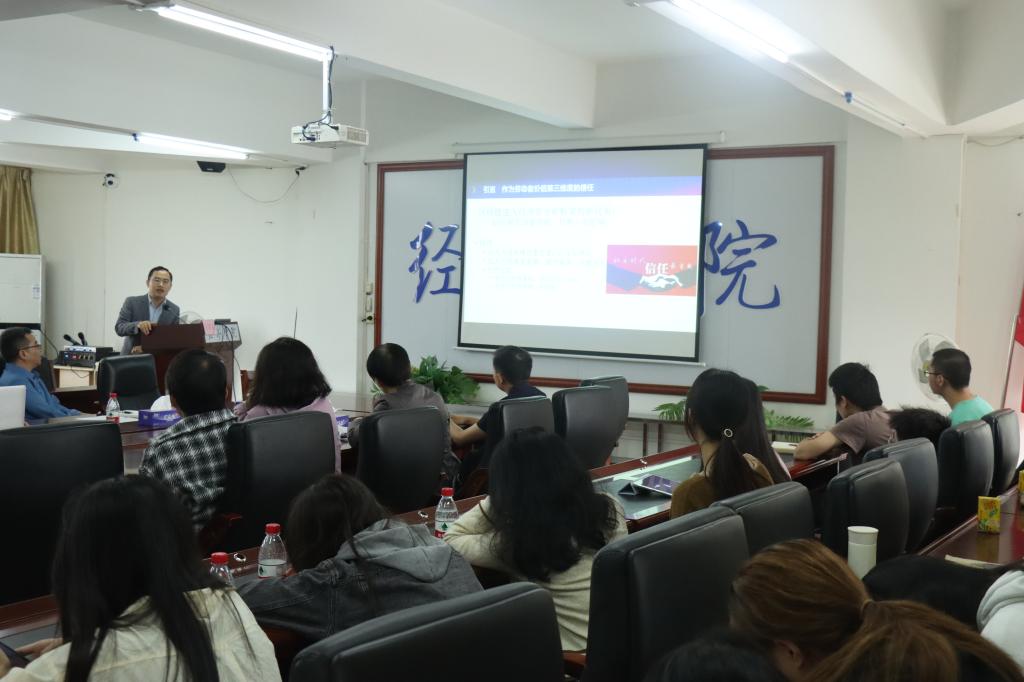 会上,郭广珍教授向各位师生介绍了自己目前的研究方向——区块链经济学。结合个人对“区块链”领域的深刻、独特的见解,用浅显易懂的语言及生活中的常见场景,让各位师生对一些复杂、陌生的概念,诸如区块链加密原理、信任保障机制(共识机制)、信任执行机制(智能合约)等,有了更为清晰、具体的认知。学术报告结束后,郭教授和各位师生进行面对面互动交流,对大家所提出的经济类问题以及发表论文的过程中常常遇到的易错点与难点,提出相应的指导方向和详细的解决措施。