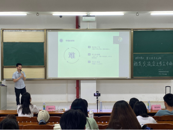 会上,谢建杰介绍了公务员考试时间、科目题型与备考工具,强调考生心态非常重要,希望有意向参加公考同学“专心面对每一份试卷、细心做好每一道题、耐心等待那一场考试”。何湄瑩就“如何收集考公信息、选择合适岗位、制定备考计划”三大问题展开,建议同学们平日多关注时政新闻,学习优秀申论范文,积累金句。袁文怡以公务员考试报录比、题型题量分布等数据为基础,分析了近几年国考省考市考的特点与趋势,鼓励同学们在备考路上劳逸结合,坦然面对努力结果。因工作没能回校的校友王超,进行线上分享,祝愿同学们学会奉献,敢于担当,将小我融入祖国的大我、人民的大我之中。
