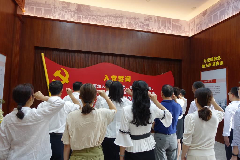 在黄学增纪念亭内,黄学增烈士铜像立于中间,墙壁上整齐陈列着黄学增生平简介,全体人员在瞻仰革命烈士的英雄风采后,向黄学增烈士雕像三鞠躬,表达对先烈深切缅怀和崇高敬意。在学院党委书记肖文辉的带领下,全体党员在党旗面前宣誓,重温了入党誓词。