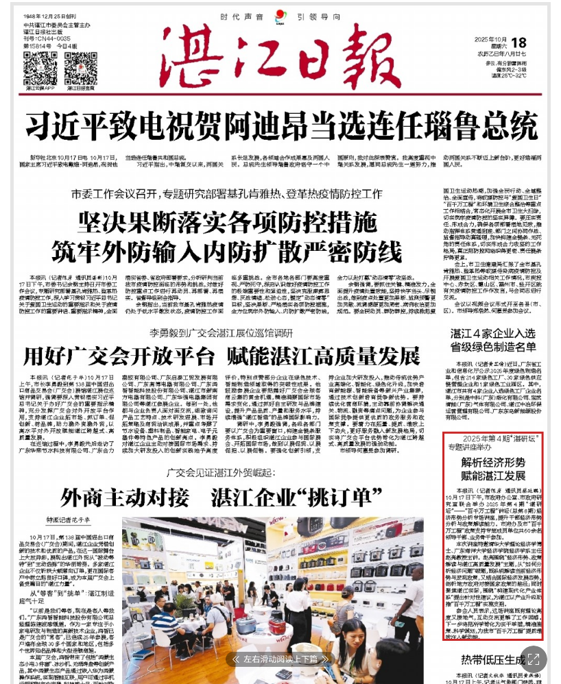 10月17日下午,湛江市政府办公室、市政府研究室联合举办2025年第4期“湛研坛”——“百千万工程”讲坛(总第8期)经济形势分析专场讲座,提升干部经济形势分析与政策解读能力。湛江市府办及市“百千万工程”政策支持专班成员单位共60余名领导干部、业务骨干参加。