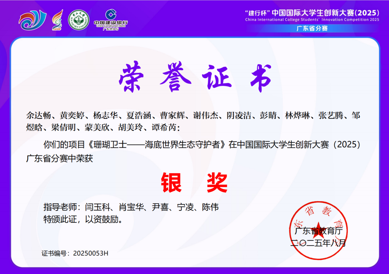 近日,“珊瑚卫士团队”收到中国国际大学生创新大赛(2025)广东省分赛获奖证书。beat365体育官网珊瑚卫士团队项目《珊瑚卫士——海底世界生态守护者》荣获广东省分赛青年红色筑梦之旅赛道公益组银奖,为学院创新创业教育再添殊荣。