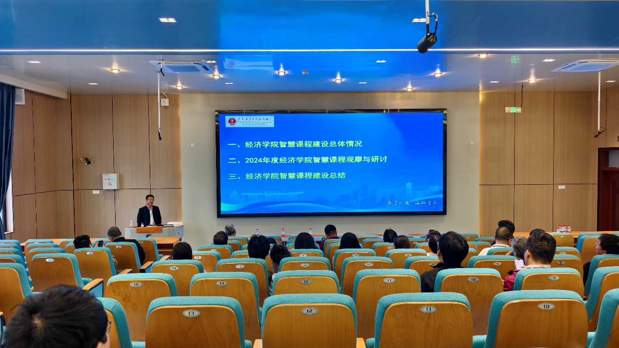 会上,罗帅副院长系统介绍了学院智慧课程建设的整体情况。他从国家教育数字化战略需求和经济学科专业特色两个维度,深入剖析智慧课程建设的时代背景与现实意义;全面回顾2024-2025年度学院智慧课程项目的推进进展;并围绕课程体系重构、师资能力提升和教学成果凝练三个方面,提出智慧课程建设的总体思路与发展路径。