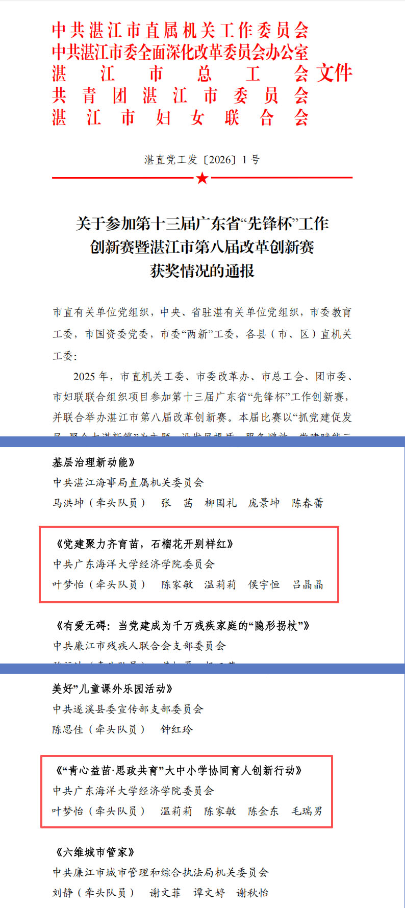 近日,湛江市第八届改革创新大赛获奖名单正式公布。我校在此次大赛中表现优异,共获得一等奖1项、二等奖3项、三等奖3项,总计7个奖项。其中,beat365体育官网党委独揽两项大奖,较好展现了学院在党建引领、协同育人等方面的创新实践与扎实成效。