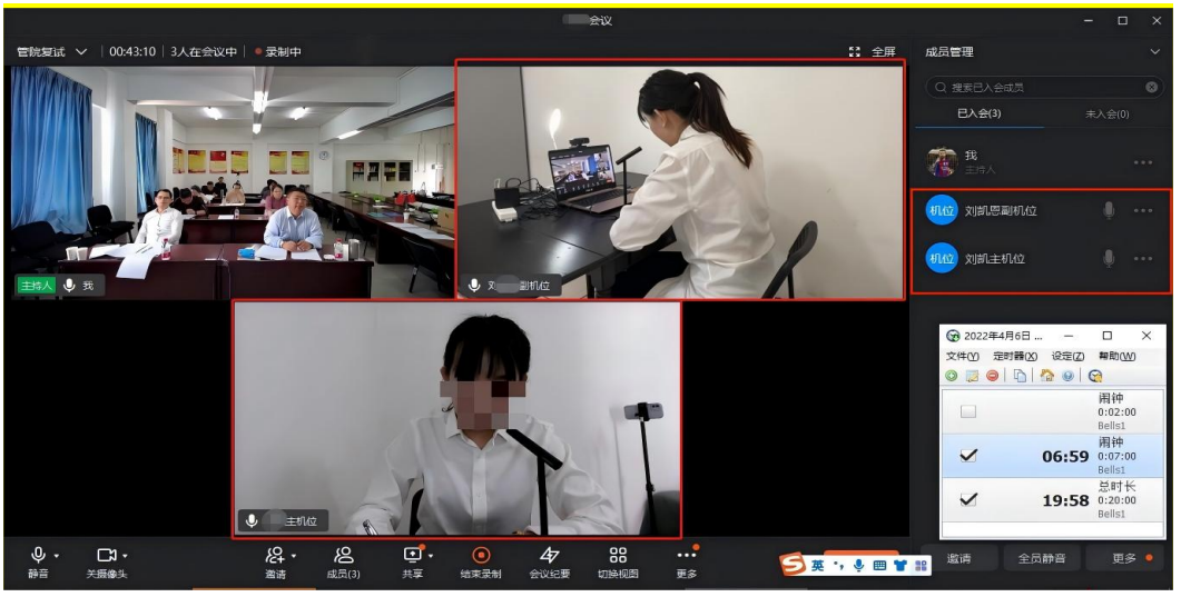 1)复试形式:通过腾讯会议复试,复试前发给考生会议号。考试采用双机位方式。需准备具有摄像头的2个联网视频设备(1台电脑+1部手机或2部手机),请考生用两个设备分别登录腾讯会议(需两个账号),并确保设备电量充足。