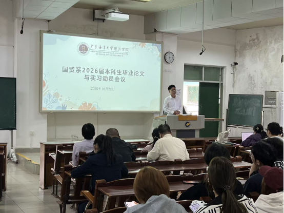 为扎实做好2026届本科生毕业论文与毕业实习工作,引导学生明确任务要求、规范写作流程、树立学术诚信意识,10月22日下午,国贸系在广学楼328教室组织召开2026届本科生毕业论文与实习动员会议。国贸系主任刘宏楠、副主任杨景院、全体论文指导教师及2026届国贸专业本科生参加会议。会议由杨景院老师主持。