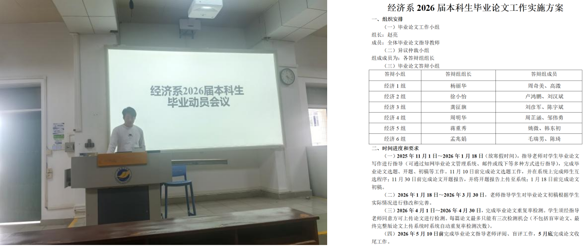 会议围绕经济系有关工作方案文件展开,就毕业论文的全程安排与毕业实习的具体要求进行详细解读和部署。在毕业论文方面,系统介绍毕业论文的组织架构、时间节点与关键环节。本届论文工作自2025年11月启动,2026年5月底完成毕业论文相关工作与成绩录入。工作方案涵盖论文选题、开题、初稿撰写、重复率检测、盲审抽检、答辩等阶段,并明确各环节的截止时间与质量要求。特别强调,论文须通过AIGC检测与重复率筛查,盲审不合格者将无法参加答辩,首次答辩不通过与抽检入选问题论文名单学生需参与二次答辩。会上对答辩形式、二次答辩机制等细节作详尽说明,提醒同学们尽早准备、主动沟通、遵守学术规范和严格按时推进。在毕业实习方面,依据学院安排明确实习时间为2026年1月15日至5月1日,学生需累计完成不少于4周的分散实习。会议要求实习指导老师加强过程管理与实地检查,提醒学生注意实习过程中的人身安全,实习完毕后学生须按要求提交《实习周日志》《实习报告》等材料,并在“校友邦”平台完成相关操作。
