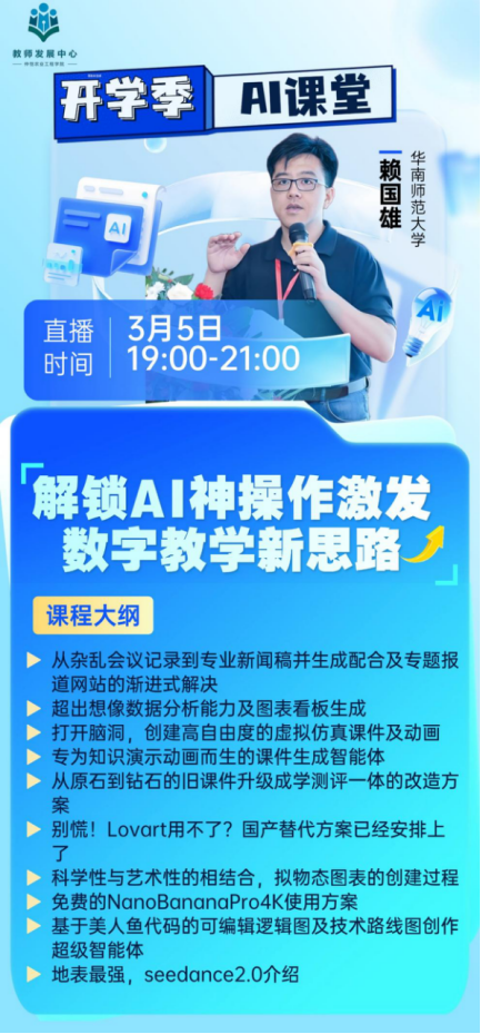 为主动应对高等教育数智化转型浪潮,全面提升教师人工智能应用能力,2026年3月5日,beat365体育官网正式启动“2026年人工智能师资培训计划”,并成功开展首期专题培训。本次培训以《AI驱动的多模态教学资源开发实战》为主题,由华南师范大学网络教育学院赖国雄主任主讲。beat365体育官网全体教师通过线上直播方式参与培训。
