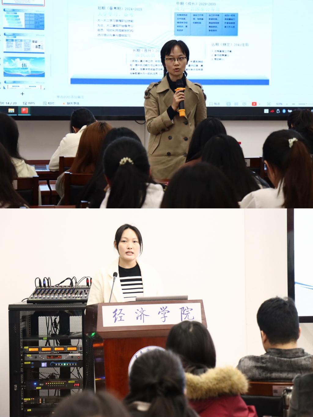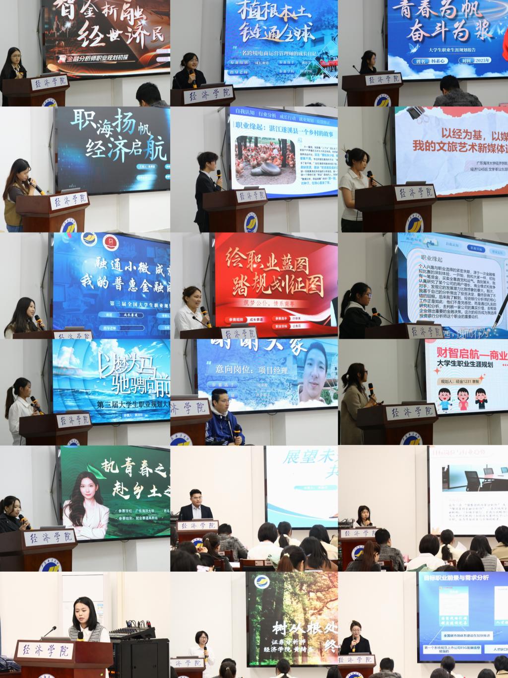 赛事分设“成长赛道”与“就业赛道”。在成长赛道中,低年级选手们立足专业,畅谈对大学生活的构想与长期发展蓝图,展现了扎实的学业基础和蓬勃的朝气。在就业赛道,高年级学子则聚焦现实,凭借清晰的自我定位、深入的行业分析和成熟的求职策略,充分展示了经院学子卓越的综合素养与职业潜力。选手们通过个人展示与现场答辩,呈现了一场场充满思辨与激情的生涯规划盛宴。答辩环节结束后,文雨辰老师与李小涛老师分别对成长赛道和就业赛道的选手表现进行了集中、专业的点评。经过激烈角逐,最终评选出各赛道的金银铜奖。学院领导与评委老师共同为获奖选手颁发了证书,对他们在比赛中的优异表现表示祝贺。