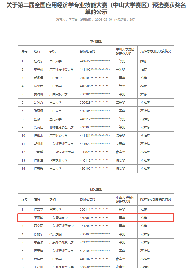 我院2024级研究生梁丽敏同学参加了中山大学赛区预选赛,在数据处理、模型构建与实证分析等环节中表现突出,凭借扎实的专业功底荣获研究生组一等奖,并成功晋级全国总决赛。