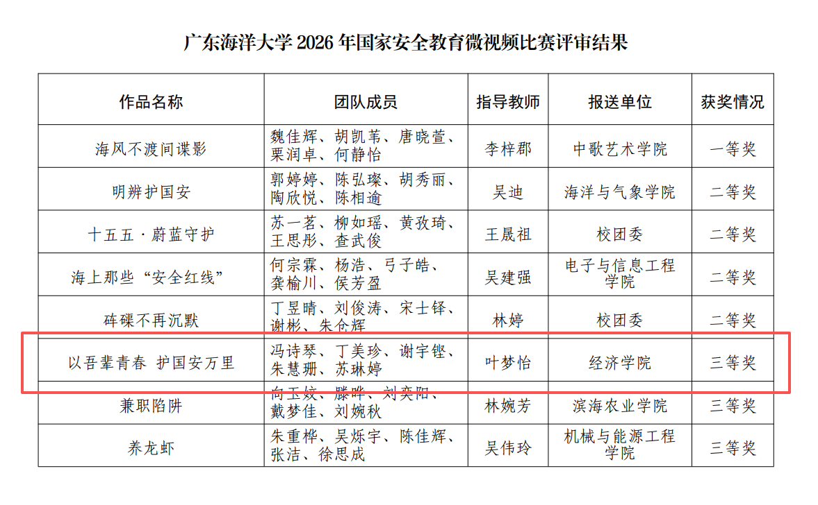 近日,广东海洋大学举办2026年国家安全教育微视频比赛,旨在迎接我国第十一个全民国家安全教育日,增强师生国家安全意识,并遴选优秀作品参加省级大赛。