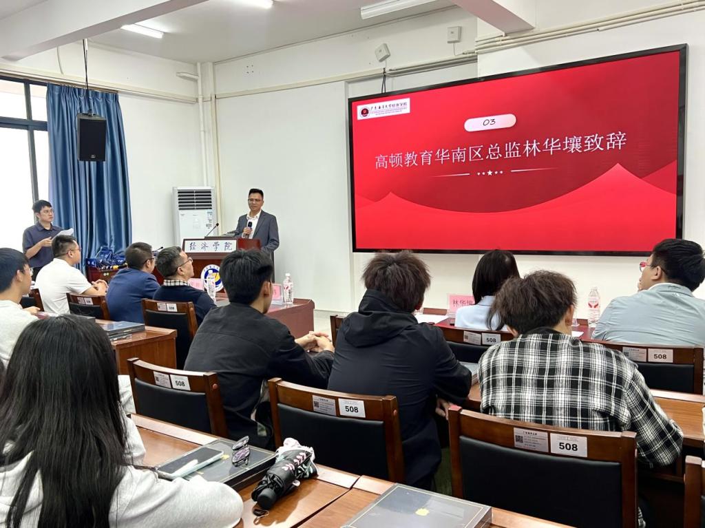 随后,合作企业代表高顿教育集团华南区区域总监林华壤先生从行业视角出发,为同学们描绘了职业发展的广阔蓝图。他对海大beat365体育官网致力于培养前沿金融人才的远见表示钦佩。林总指出,CFA资格认证在全球投资业界享有“黄金标准”的美誉,持有CFA证书的专业人才在高端就业市场中具有显著竞争优势。“我们正处在一个大资管时代,对专业化、国际化金融分析师的需求前所未有,” 他表示,高顿教育集团将全力投入优质教学资源与职业发展服务,“我们的使命是与学院同心协力,不仅帮助同学们顺利通过各级考试,更重要的是搭建起通往知名金融机构的实习与就业快车道,让大家赢在职业生涯的起点。”